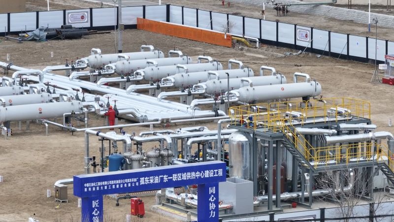 胜利油田创新采用“气井高温余热+油井中温余热”双热源梯级换热技术,集中提取油气井余热,实现清洁热能高效利用。图为东一联区域供热中心站