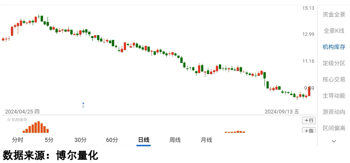去年金价猛涨的时候,朋友阿杰买了一只黄金相关的标的,当时金价屡创新高,公司业绩也增长了16%,市盈率才8倍,怎么看都是好机会。阿杰以为肯定会有好表现,结果标的表现一直拉胯,后来还创了新低。我让他看「机构库存」数据,发现从金价上涨开始,橙色柱子就持续减少,说明机构资金已经放弃了这个标的。